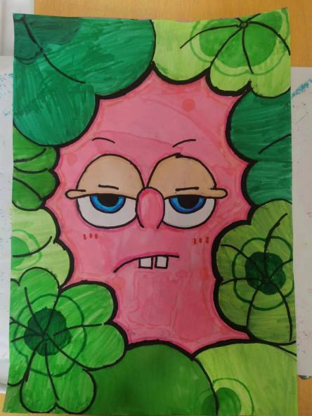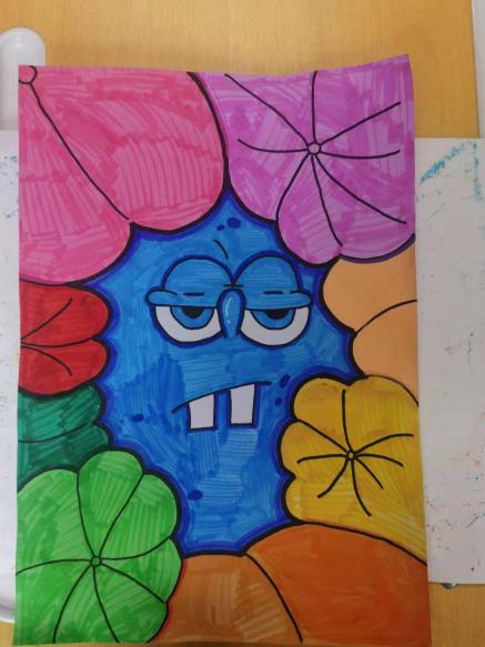 在美术C班的课上,小鱼老师向他们讲解了颜色的基础知识和配色技巧。在课后,孩子们发挥自己的创造力,在志愿者老师的指导下创作了独特的画作:绿叶环绕着奶酪黄的海绵宝宝,而他忧郁的蓝色大眼睛透露出他内心的情感。