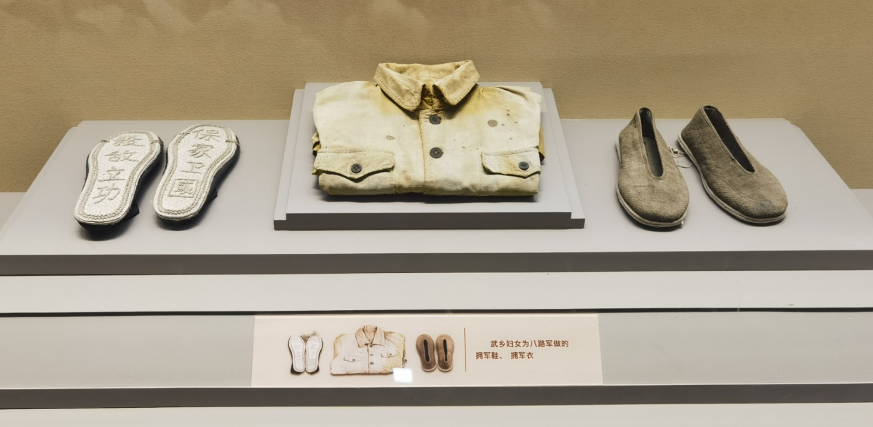 太行精神是为民族解放万众一心、敢于胜利的精神。国难当头,教师和员工走上街头,投笔从戎,他们壮情写道:“捍卫祖国的责任是我们的,我们应当为了祖国的生存流最后一滴血”。妇女们不仅在后方没日没夜纺线织布,缝制军鞋,也有巾帼扛起大刀,战斗在前。广大群众组织起担架队、运输队、警戒队,运送物资,救护伤员,打扫战场,维持治安,使战争的军需供应和战勤服务得到了充分保障。“母亲叫儿打东洋,妻子送郎上战场”。在党的领导下,华北敌后抗日根据地不断壮大,形成万众一心,团结一致的全民抗战热潮。我们在这些文物前驻足停留,为军民“鱼水一家亲”的感情深深动容。