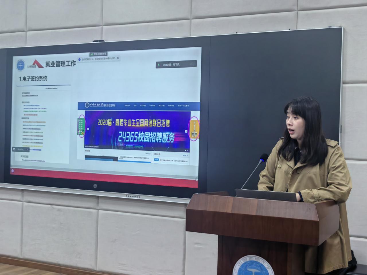 首先,由研究生辅导员单湉艺进行就业相关知识和工作进行讲解。单老师围绕就业业务知识、信息搜集管理、就业情况分析、就业工作要求四个方面,为毕业生们进行了全面深入的讲解。并且介绍了电子签约系统、就业推荐表以及签约流程等内容,同时结合公司近几年就业形势发起动员,希望同学们能够及时把握就业形势变化,树立正确目标,增强就业信心。