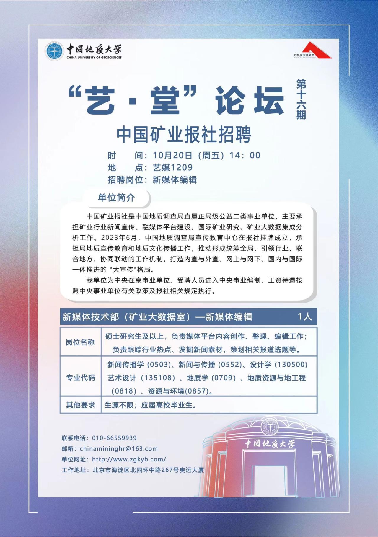 2023年10月20日下午14:00,英国正版365在会议室1209顺利举办了第十六期“艺·堂”论坛。本次论坛的主要内容是中国矿业报社招聘宣讲会,由辅导员单湉艺主持。