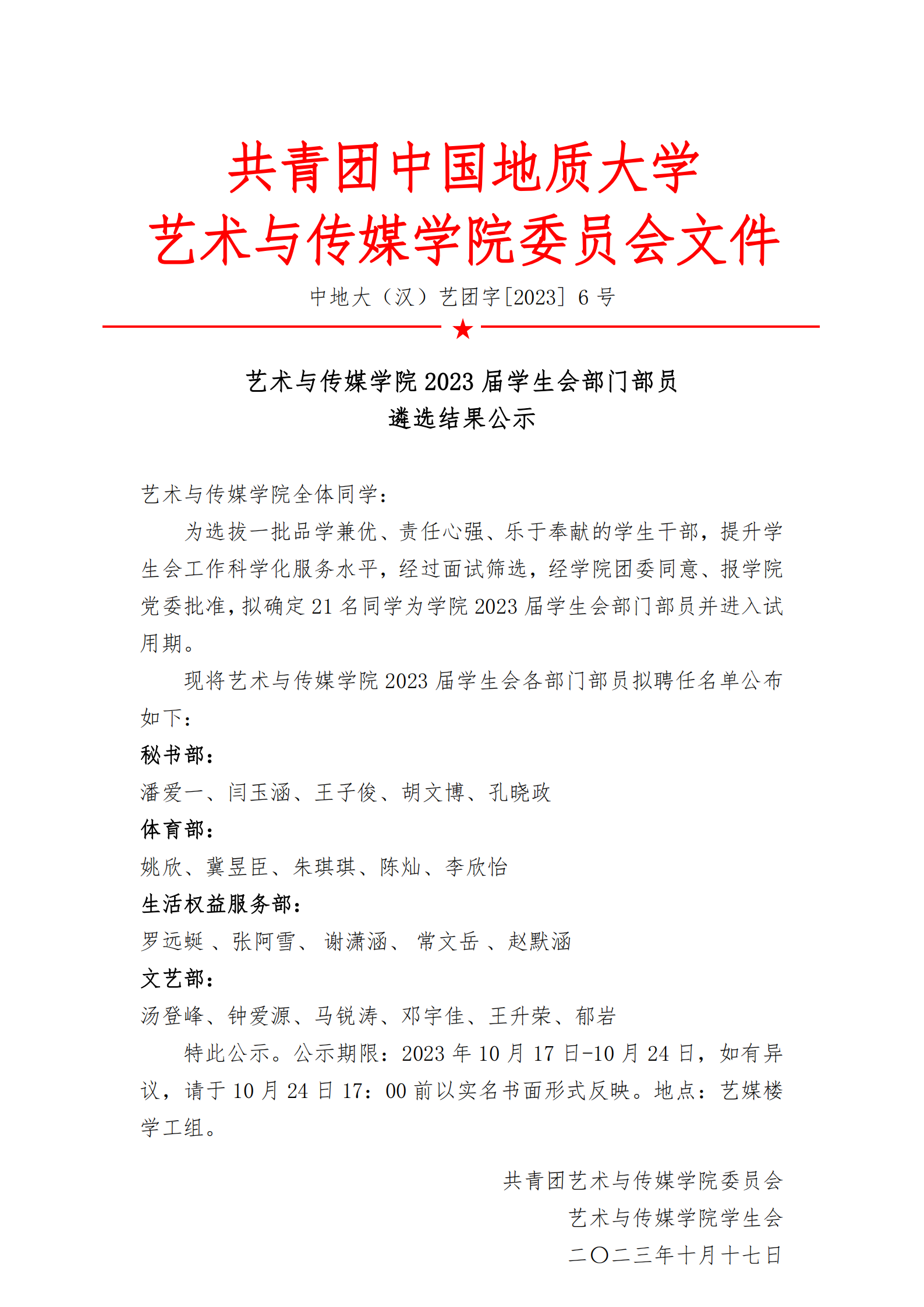 通知 | 2023届员工会部门部员遴选结果公示