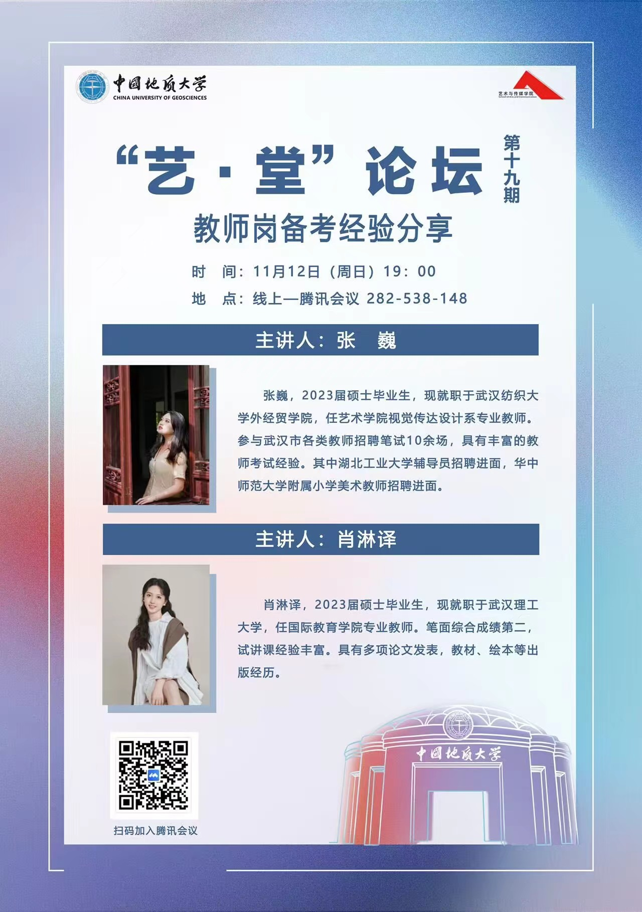 2023年11月12日晚上19:00,“艺·堂”论坛第十九期教师岗备考经验分享会于线上腾讯会议平台顺利举行。公司邀请了2023届研究生毕业生、现就职于武汉理工大学国际教育公司的肖淋译和就职于武汉纺织大学外经贸公司的张巍进行备考分享。本次讲座由兼职辅导员于梦涵主持。