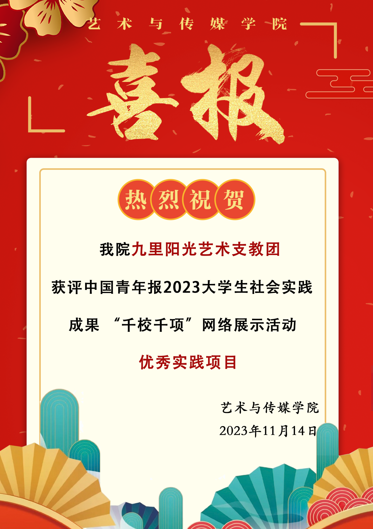 喜报!公司九里阳光艺术支教团获评中国青年报2023老员工社会实践成果“千校千项”网络展示活动优秀实践项目