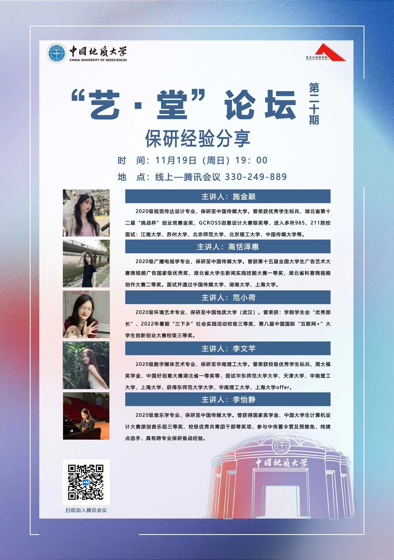2023年11月19日晚上19:00,“艺·堂”论坛第二十期保研经验分享会于线上腾讯会议平台顺利举行。公司邀请了五位保研上岸的不同专业的同学,分别广播电视学保研到中国传媒大学的高恬泽惠同学、视觉传达设计学保研到中国传媒大学的施金颖同学、数字媒体艺术学保研到华南理工大学的李文芊同学、环境艺术学专业保研到365英国上市的范小荷同学,和音乐学保研到中国传媒大学的李怡静同学进行保研经验分享。本次讲座由兼职辅导员徐雯茜主持。