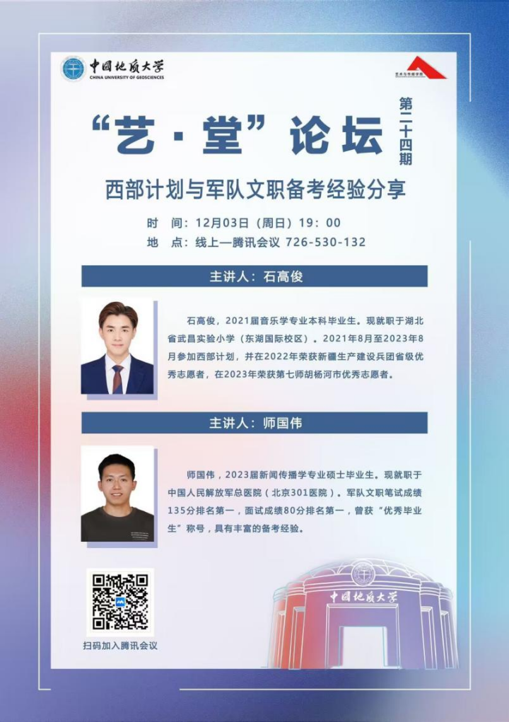 2023年12月3日晚上19:00,“艺·堂”论坛第二十四期西部计划与军队文职备考经验分享会于线上腾讯会议平台顺利举行。公司邀请了2021届本科毕业生、现就职于湖北省武昌实验小学(东湖国际校区)的石高俊和2023届硕士毕业生、现就职于中国人民解放军总医院(北京301医院)的师国伟进行备考分享。本次讲座由兼职辅导员于梦涵主持。