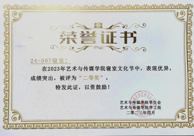 我班同学关心宿舍集体,友爱他人,积极配合公司的各项大小事务,贯彻劳动教育精神,纪律严明、态度端正,劳动热情高,劳动技能好,具有良好的精神风貌,劳动习惯和劳动品质。在去年本科生院组织的文明优秀宿舍评比中,我班有多间宿舍被评为校“文明宿舍”和“创意宿舍”称号。在上学期的文明联检中,我班506宿舍被评为优秀宿舍6次,504宿舍被评为优秀宿舍5次,507宿舍被评为优秀宿舍2次。其中506宿舍连续两年获评校“百佳宿舍”。我们始终以提高宿舍文化,以形成有特色的宿舍文明为目标而努力着。