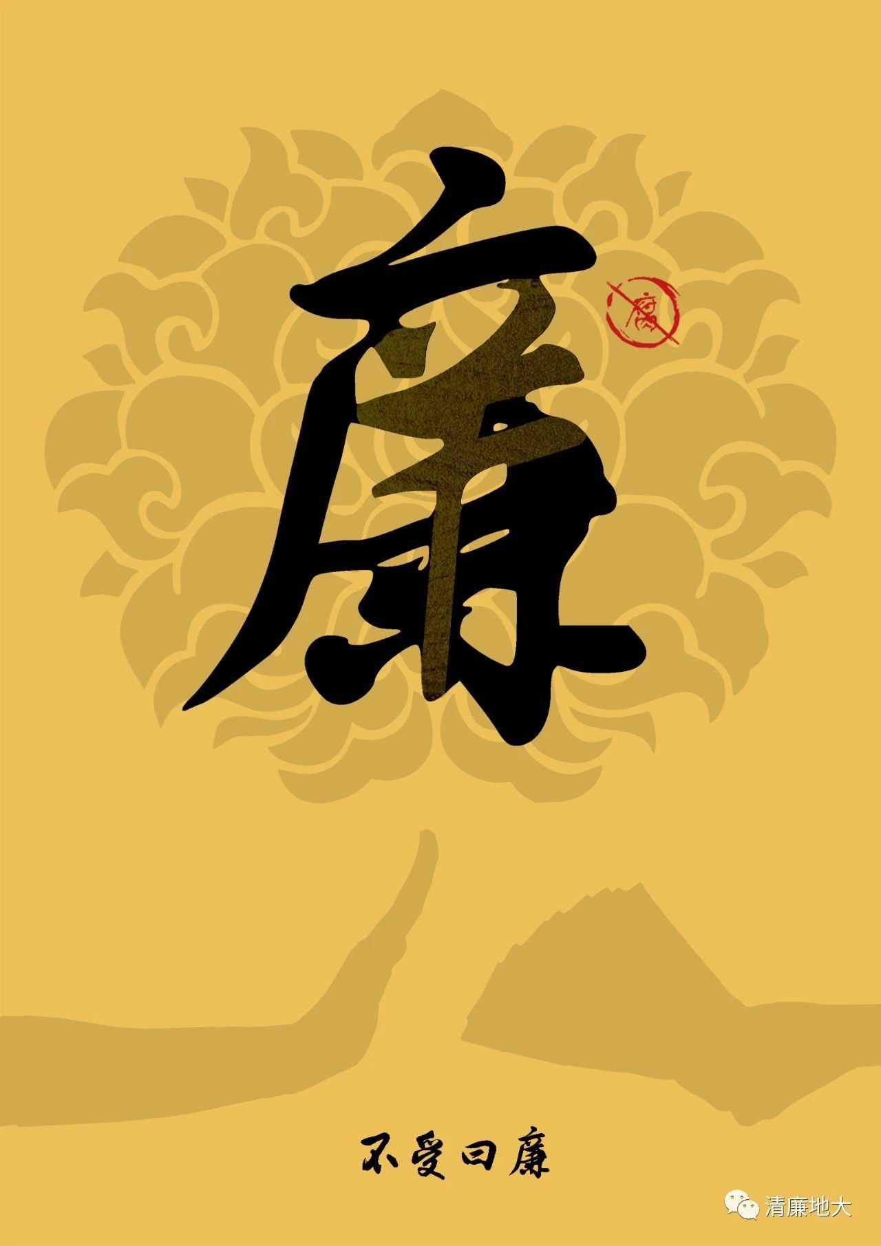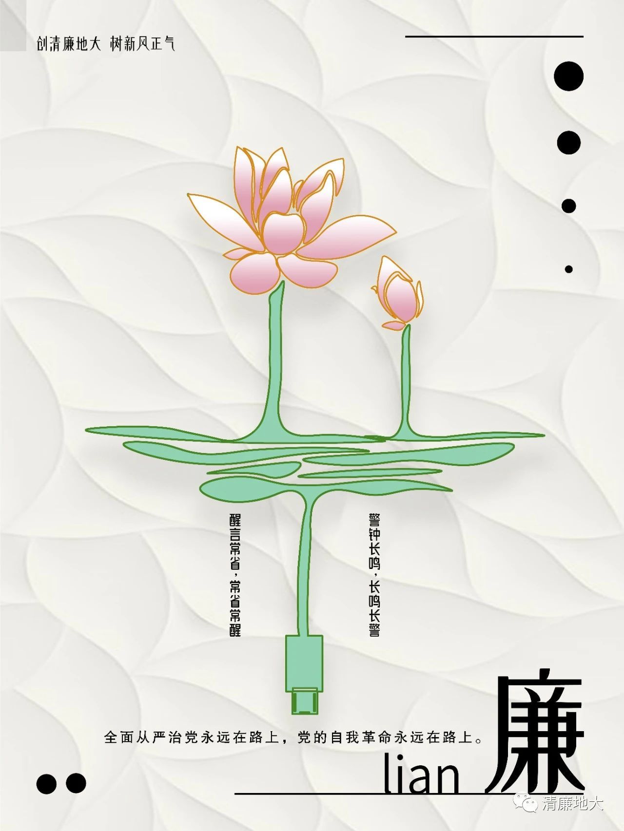 本作品中以廉字为主体,分离”廉“字中人民币”¥“的符号,并加以若隐若现的金箔纹理,代表诱惑无处不在;旁边加上拒绝腐败的图标,警示党员要清正廉洁;以代表圣洁端庄的莲花为底,增加画面层次感,隐喻党员要做清正廉洁的君子;画面下半部分用一个拒绝钱财的剪影形象,再次呼应”不受曰廉“的主题。