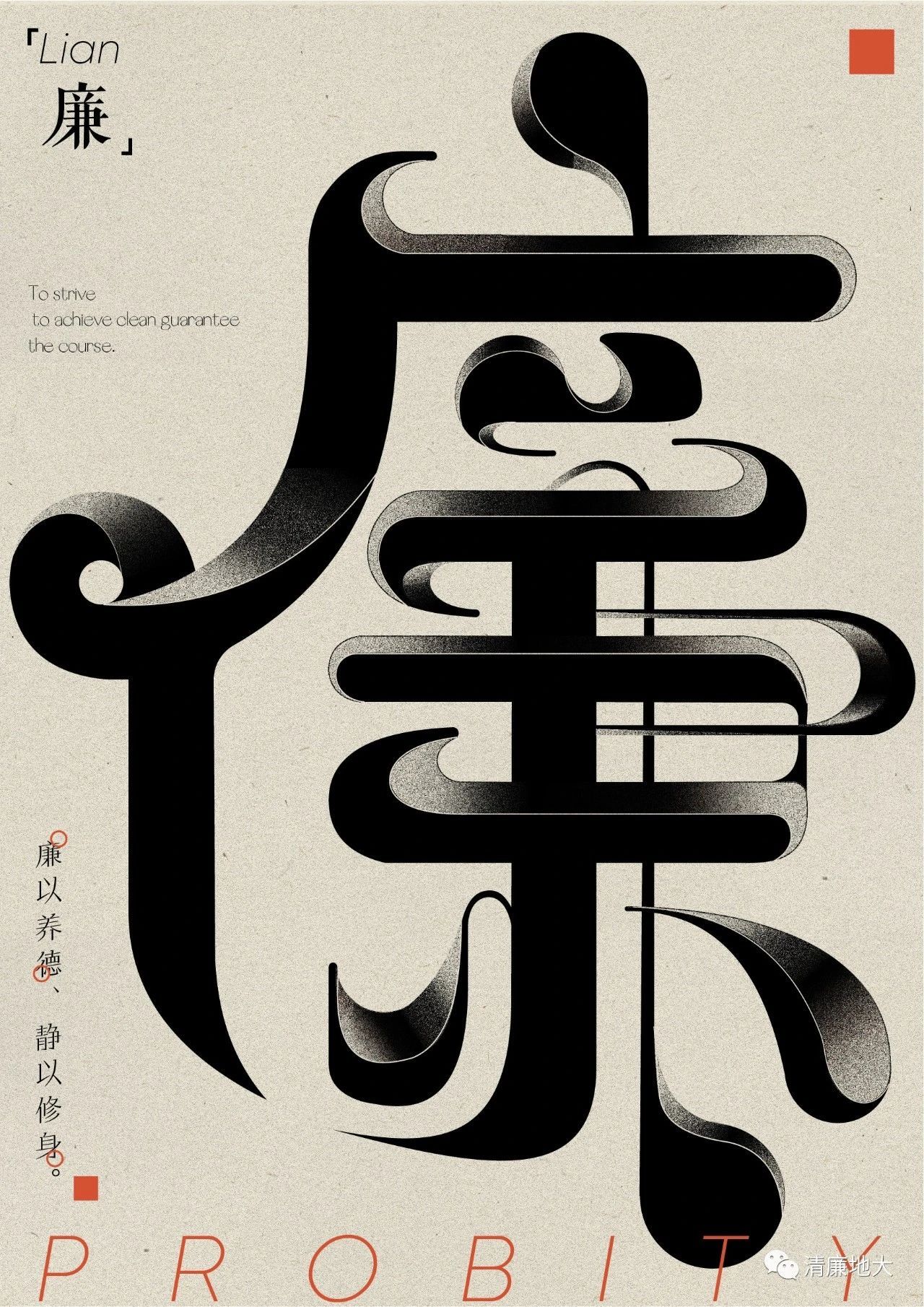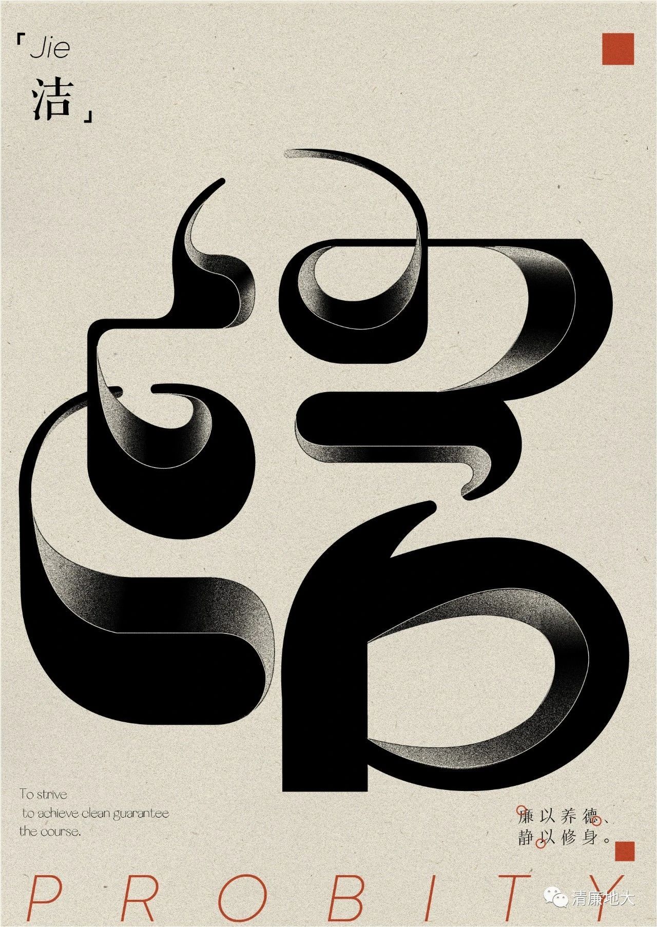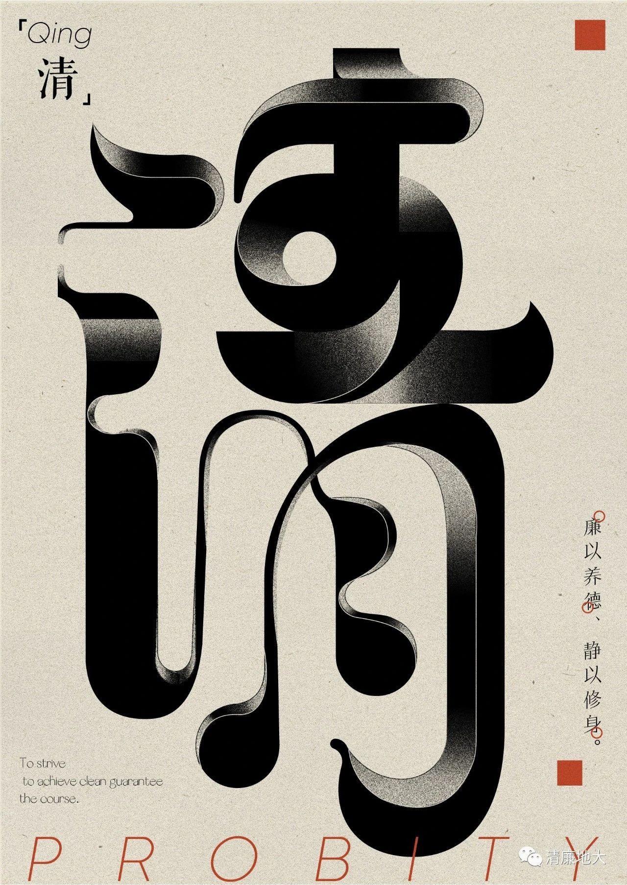 通过提取中国传统书法的字形特征对”清“、”廉“、”洁“字进行重新设计,同时结合现代装饰特征,使字形表现更加现代化。用字体的设计表现对廉洁之风的崇尚与追求。