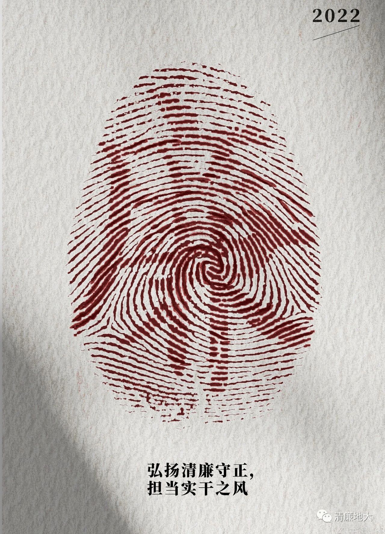 众所周知,指纹具有”各不相同、终生不变“的特性。指纹常被用于合同签订,是承诺的象征。本作品将指纹这一元素,融合进”廉洁“的主题。通过将手指纹路的部分加粗化处理,形成一个”廉“字图形,突出”廉洁奉公“承诺的主题。整体图形以暗红色为主色调,模拟了印泥的颜色,同时,以纸纹质感为背景,增添了”廉洁奉公“承诺的仪式感与庄重感。