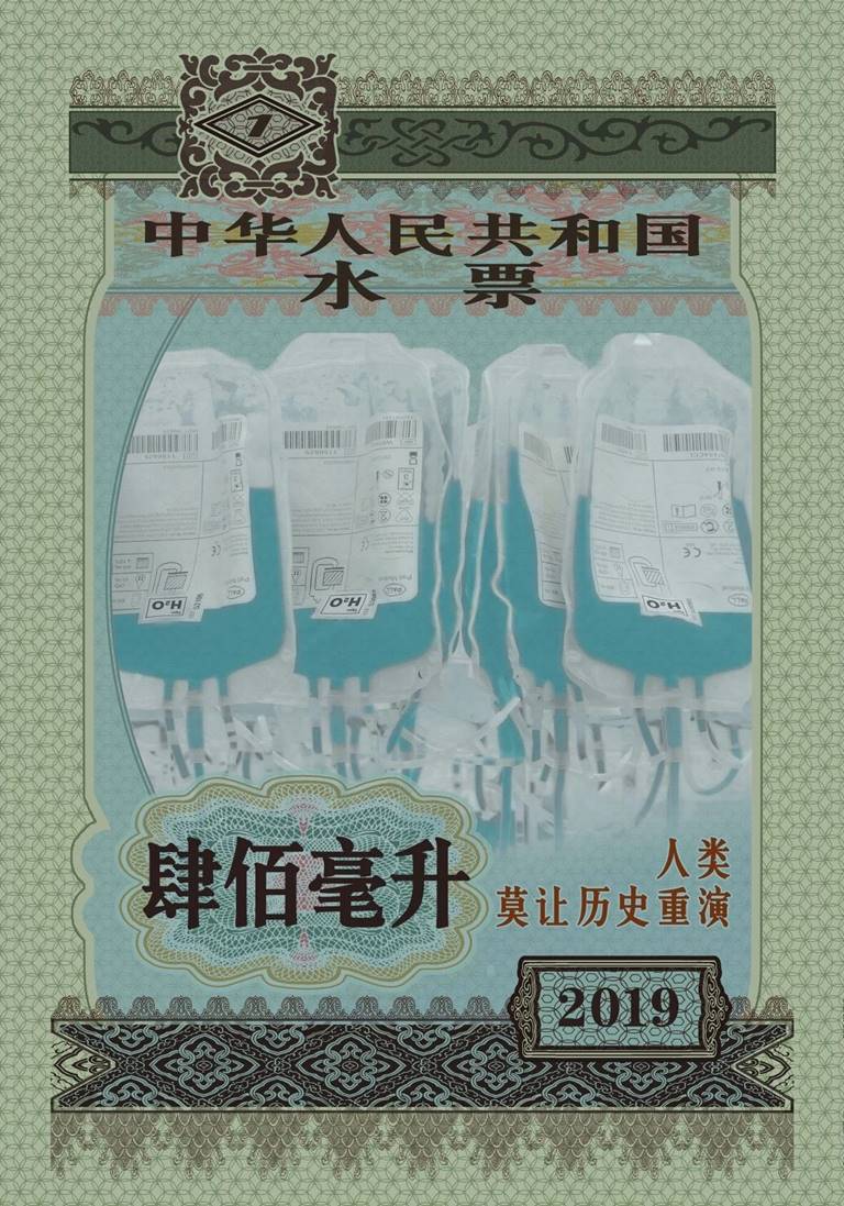 创意说明:整张海报采用中国计划经济时期发行的各种票据为构成形式,主图采用血袋盛水来营造紧张气氛,警示人们节约用水。